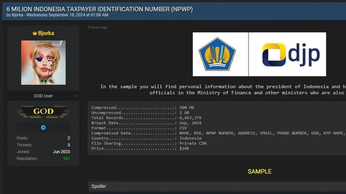 Dia mengunggah tangkapan layar sebuah akun bernama Bjorka yang menjual 6 juta data NIK dan NPWP. Data tersebut dijual di sebuah forum seharga 10.000 dollar AS atau setara Rp 153 juta (kurs Rp 15.300 per dollar AS). Presiden Joko Widodo (Jokowi) memberikan tanggapan terkait dugaan kebocoran 6 juta data NIK dan NPWP, yang di antaranya termasuk data pribadi dirinya. Jokowi mengatakan, sudah memerintahkan Kementerian Komunikasi dan Informatika, Kementerian Keuangan, dan Badan Siber dan Sandi Negara (BSSN) untuk melakukan mitigasi secepatnya.